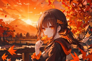 (masterpiece),illustration, best quality, best refined rendering, extremely detailed, CG unity 8k wallpaper, sharp and clean edges, less noise, drawing as detailed and clear as possible, vivid and bright and colorful picture, masterpiece,best quality,(ray tracing,cinematic lighting),sunlight,autumn, autumn_leaves, falling_leaves, fire, ginkgo_leaf, holding_leaf, leaf, maple_leaf, orange_sky, orange_theme, sunset, tree, leaves_in_wind, braid, leaf_hair_ornament, 1girl, twilight, dusk, evening, gradient_sky, burning, leaf_background, breathing_fire, campfire, fireplace, yellow_sky, solo, molten_rock, leaf_on_head, brown_hair, from_side, sweet_potato, flame, fence, outdoors, orange_flower, red_sky, explosion, ribbon, upper_body, orange_ribbon, mountainous_horizon, bare_tree <lyco:GoodHands-beta2:0.9> <lora:PAseer的神话壁纸V1:0.3>