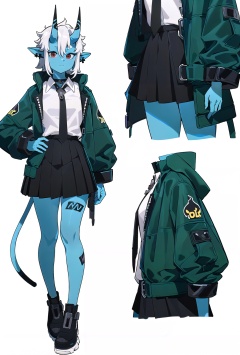 8k, best quality, masterpiece, (ultra-detailed:1.1), (high detailed skin), (full body:1.2), white background, standing, looking at viewer, (solo:1.4), hand on hip, <lora:cangjiao-v100:0.8:lbw=OUTALL>, cangjiao, 1girl, horns, open jacket, white shirt, black pleated skirt, pointy ears, blue skin, black necktie, red eyes, black footwear, tail, (white background, simple background:1.5), <lora:EnvyBetterHands LoCon_beta2 辅助:0.55>, ( good hands, nice hands:0.5), (beautiful_face), ((intricate_detail)), clear face, ((finely_detailed)), fine_fabric_emphasis, ((glossy)), full_shot