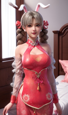 masterpiece,(best quality),official art, extremely detailed cg 8k wallpaper,((crystalstexture skin)), (extremely delicate and beautiful),highly detailed,hair_ribbon,twin_braids,animal_ears,1girl,solo,long hair,headwear,(standing),( hair),(dress:0.987),(chinese clothes:0.897),(tight_pants:0.988),((upper body)),sweet smile, (medium breasts),((hair_ornament)),detached_sleeves,clothing_cutout,(sunshine, indoor,(bed)),((looking_at_viewer)), <lora:hipoly3DModelLora_v10:0.3>