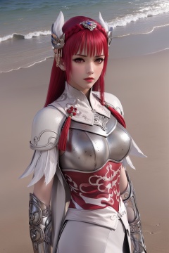masterpiece,(best quality),(3d)official art, extremely detailed cg 8k wallpaper,((crystalstexture skin)), (extremely delicate and beautiful),highly detailed,((hair_ornament)),(face,eyes),1girl,solo,long hair,headwear,(standing),(red hair),(closed mouth),(looking at the audience:1.3),(Facing the camera:1.3),hand,gloves,makeup,((armor)),,(dress,chinese_clothes,skirt),((Summer, beach, sunbathing, seaside)),((looking_at_viewer)), (medium breasts), (upper body), <lora:hipoly3DModelLora_v10:0.3>