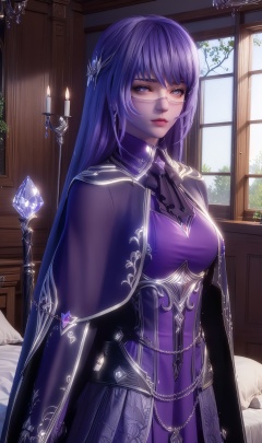 masterpiece,(best quality),official art, extremely detailed cg 8k wallpaper,((crystalstexture skin)), (extremely delicate and beautiful),highly detailed,1girl,solo,long hair,headwear,(standing),(purple hair),((dress)),((veil)),(overcoat,mace)((upper body)), (medium breasts),((hair_ornament)),armor,(sunshine, indoor,(bed)),((looking_at_viewer)), <lora:hipoly3DModelLora_v10:0.3> <lora:枫岫-神印王座-圣采儿00:0.7>