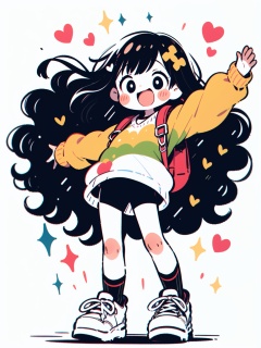 HTTP, 1girl, blush stickers, black hair, long sleeves, open mouth, smile, shoes, dot nose, white footwear, hair ornament, shorts, standing, sweater, backpack, bangs, solo, puffy long sleeves, white background, outstretched arms, :d, socks, full body, hands up, blush, sneakers, heart, heart hair ornament, simple background, black shorts, bag, black eyes<lora:HTTP_20231126194709-000006:1>