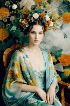 a woman sitting in a chair with a flower in her hair, style of paolo roversi, kaleidoscopic colors, model, wearing a luxurious silk cloak, by sam weber, face obscured, photographic print, ghost of a young girl, photo still, patterned clothing