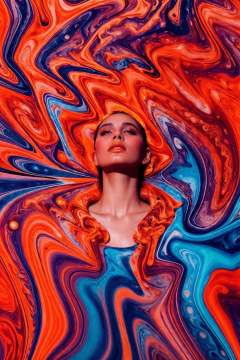 woman, (Jupiter textile print:1.2), fashion, melting, glassmaze, optical illusion,( simple background:1.2), marbled swirls, orange tone, dune, fluid, neon light