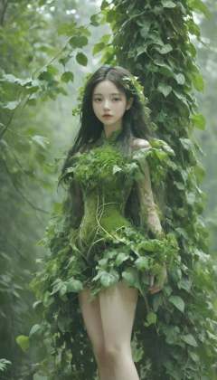<lora:xl-shanbailing-1103Wood elements-bailong plant girl:0.8>,bailong plant girl,(1girl:1.1),A girl made of fresh plants,1girl,leaf,outdoors,realistic,vines,Tree,in the outdoor forest,