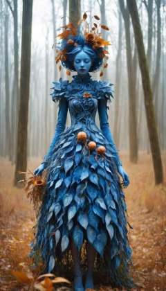<lora:xl-shanbailing-1103Wood elements-bailong plant girl:0.8>,bailong plant girl,(1girl:1.1),a girl made out of dead blue plants,in the outdoor forest,in autumn,
