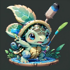 Game icon (jz), Kawaiijeni turtle painter changes its body color to match its energetic painting. Render it in an animated style, focusing on the Jeni turtle's cute large eyes and intricate patterns on its body.
