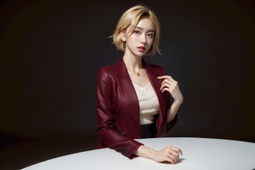 Girl, red wool coat, pretty face, short hair, blonde hair, (photo reality: 1.3) , Edge lighting, (high detail skin: 1.2) , 8K Ultra HD, high quality, high resolution, best ratio of four fingers and one thumb, (photo reality: 1.3) , wearing a red coat, white shirt inside, large breasts, solid color background, solid red background, advanced feeling, texture pull full, 1 girl, xiqing, hszt, xiaxue, dongji