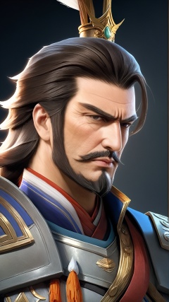 (Ancient military commander) Game cg (hyperrealistic thick strokes: 1.5) (multi-angle view) Close-up shot of a resolute general with a rectangular face standing proudly in all directions, with straight and powerful lines on his face. His hair is neatly styled, he is wearing armor, and he exudes majesty.