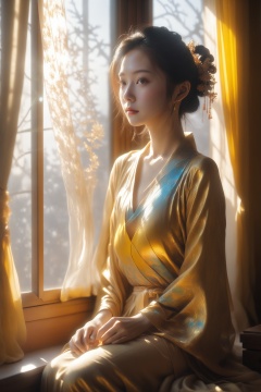 1girl, qingsha,mature female,Gold colorful theme, (((masterpiece,best quality))),((good structure,Good composition,good atomy)), ((clear, original,beautiful)),qingsha,fantastic coloured glaze,Fractal, light master,girl,windowsill, sunlight