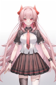 Mora, 1girl, solo, long hair, earrings, necktie, looking at viewer, black gloves, single thighhigh, pleated skirt, black skirt, single elbow glove, red horns, white shirt, thigh strap, very long hair, medium breasts, short sleeves, black thighhighs, cowboy shot, plaid skirt, choker,