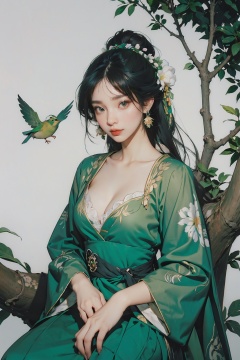a woman in a green dress sitting on a tree branch with a bird flying over her head and a bird flying over her head,1girl,hanfu,hair ornament,black hair,long sleeves,chinese clothes,shawl,holding,jewelry,solo,long hair,full body,dress,tassel,earrings,tree,forehead mark,wide sleeves,breasts,hair stick,flower,hair bun,green dress,cleavage,bird,closed mouth,norfleet,Best quality,masterpiece,ultra high res,