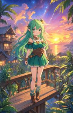 masterpiece,best quality,1girl,elf,standing,looking at viewer,night sky,colorful sunset,clouds,cloudy,coconut tree,foliage,potted plants,treehouse,balcony,green hair,long hair,