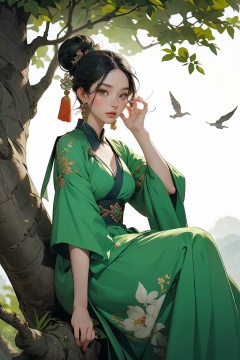 a woman in a green dress sitting on a tree branch with a bird flying over her head and a bird flying over her head,1girl,hanfu,hair ornament,black hair,long sleeves,chinese clothes,shawl,holding,jewelry,solo,long hair,full body,dress,tassel,earrings,tree,forehead mark,wide sleeves,breasts,hair stick,flower,hair bun,green dress,cleavage,bird,closed mouth,norfleet,Best quality,masterpiece,ultra high res, chinese clothes