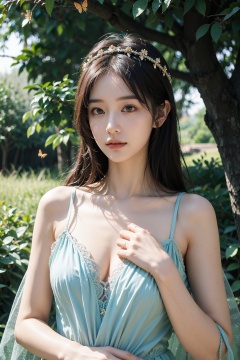 (masterpiece:1.2),best quality,highres,ultra-detailed,HDR,UHD,studio lighting,ultra-fine painting,sharp focus,physically-based rendering,extreme detail description,A springtime fairy,blooming meadow, enchanting, delicate, ethereal beauty, graceful,flowing golden hair, emerald green eyes, afloral wreath crown, petals gown, translucent and shimmering,butterflies and fireflies, a gentle breeze, dappled sunlight, creating a warm ambiance,a sense of rebirth, magic of spring, a fairy princess,pastel colors and soft greens theme, dappled sunlight, soft focus, magical ambiance,bdi,(flat color:0.5),chest