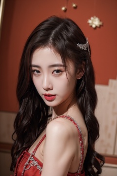 in love, simple red dress, cleavage, detailed natural skin texture, seductive gaze, detailed lighting,
