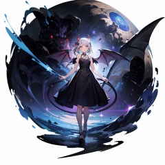 (masterpiece, best quality,top quality),[(white background:1.5)::5],(wide shot:0.95),(full body),Dynamic angle,solo,1 woman,looking at viewer,hair ornament,dragon_horns,demon_wings,silver hair,black long dress,bandaid_on_leg,),black magic,purple theme,(universe in background:1.2),star_(sky),hyper_galaxy,depth_of_field,planet in background,particle effects,