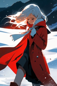 1 girl,full body,detailed face,In the snow all over the sky, a girl walking alone in the snow, wearing red thin trench coat, with a white scarf, Bare legs, bare feet, Holding her body tightly, her head bowed, her eyes closed, her mouth pressed together, and she was about to cry, Long white hair blows in the wind, The detailed and beautiful face was depressed, step by step, behind is a series of footprints, the snow is very big, the biting wind blowing her scarf, the distance is unbroken snow mountains, in this evening, helpless forward. , greyscale,sketch, monochrome, greyscale,crying, concept art, ((wlop))