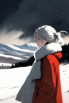 1 girl,full body,detailed face,In the snow all over the sky, a girl walking alone in the snow, wearing red thin trench coat, with a white scarf, Bare legs, bare feet, Holding her body tightly, her head bowed, her eyes closed, her mouth pressed together, and she was about to cry, Long white hair blows in the wind, The detailed and beautiful face was depressed, step by step, behind is a series of footprints, the snow is very big, the biting wind blowing her scarf, the distance is unbroken snow mountains, in this evening, helpless forward. , greyscale,sketch, monochrome, greyscale,crying, ((wlop))