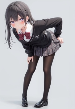 1girl, solo, pantyhose, skirt, long hair, loafers, shoes, simple background, school uniform, brown eyes, plaid, black pantyhose, plaid skirt, looking at viewer, black hair, pantyhose pull, full body, clothes pull, black footwear, pleated skirt, leaning forward, bangs, long sleeves, bent over, cardigan, bow, bowtie, standing, closed mouth, pulled by self, grey background, blush, miniskirt, red bow, sweater, **********