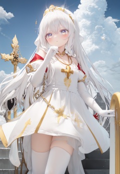 (the Kingdom of Heaven:1.3),(((There are Suspended staircase above the sky))), (((only suspended staircase))), (((Clouds surround the white suspended staircase))), The suspended staircase are snow-white, There are only suspended staircase in the sky, (((Heaven, beautiful detailed sky))),(solo:1.2),(1 girl:1.2),(loli:1.2),(white hair:1.3),(long hair:1.3),(golden eyes:1.5),white cassock,(white elbow gloves:1.3), a long, flowing garment that reaches the ground,gold dress,(red and gold trim on dress:1.3),(white thighhighs:1.2),(gold embroidery and jewels on dress,gorgeous platinum headdress:1.2),a gold pectoral cross necklace cross hanging from a golden chain around her neck,(Seraphim:1.6) ,