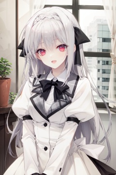 1girl, red eyes, solo, open mouth, long hair, braid, looking at viewer, bow, school uniform, window, ribbon, indoors, white hair, hair bow, fangs, hair ribbon