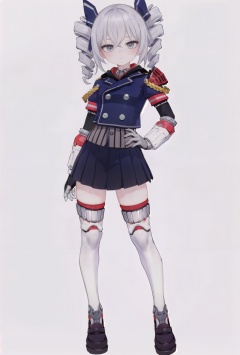 8k, best quality, masterpiece, (ultra-detailed:1.1), (high detailed skin), (full body:1.2), white background, standing, looking at viewer, (solo:1.4), hand on hip, <lora:zhanche-v100:0.8:lbw=OUTALL>, zhanche, 1girl, bronya zaychik, grey eyes, drill hair, twin drills, skirt, thighhighs, grey hair, bangs, (white background, simple background:1.5), (beautiful_face), ((intricate_detail)), clear face, ((finely_detailed)), fine_fabric_emphasis, ((glossy)), full_shot