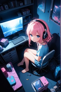 (Highest picture quality), (Master's work), ((detailed face description)),(8K wallpaper),(from above:1.2),fisheye,,1girl,(loli,little girl:1.2),(glowing eyes:1.2),pink hair,blue eyes,headphone,(bare legs),(messy room),junk food,potato chip,drink,(dark room:1.3),cable on the floor, (otaku_room,a very dim room:1.2), realistic, full_body, curtain,(realistic:0.6),dark tone, (blue tone), chaos theme, futuristic room,cyberpunk, giant monitor that display video game,bookshelf,trash can,toy,electronic gadget,,(The curtains are drawn),,blush,blank stare, playing games,(sitting on the chair),,(In (a very dim room), fluorescence from a computer screen is the only light source.),soft glow of the computer screen illuminating the space, flashing lights from the game, eerie blue hue, pov.