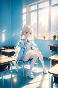 1girl,cat ears,anime style,white long hair,full body,loli,potrait,nai night scape,masterpiece,in classroom,white legwear,((sunny out side)),best quality,solo,momoko,cat ears,in seat,solo,morning,indoor,cinematic lighting,looking at window,long hair,sitting on school chair,school desk,hair ornament,hair flower,cute,white flower,light blue coat,white dress,cinematic lighting,white tail,