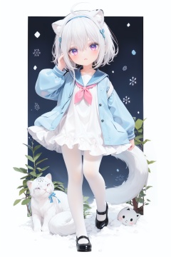 cute,Infant,solo blue shirt,blue sailor coat,loli,full body,white hair,snow leopard ear,white background,pink eyes,laugh,happy,white pantihose,white pantyhose,red armband,