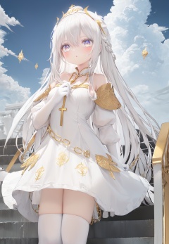 (the Kingdom of Heaven:1.3),(((There are Suspended staircase above the sky))), (((only suspended staircase))), (((Clouds surround the white suspended staircase))), The suspended staircase are snow-white, There are only suspended staircase in the sky, (((Heaven, beautiful detailed sky))),(solo:1.2),(1 girl:1.2),(loli:1.2),(white hair:1.3),(long hair:1.3),(golden eyes:1.5),white cassock,(white elbow gloves:1.3), a long, flowing garment that reaches the ground,gold dress,(red and gold trim on dress:1.3),(white thighhighs:1.2),(gold embroidery and jewels on dress,gorgeous platinum headdress:1.2),a gold pectoral cross necklace cross hanging from a golden chain around her neck,(Seraphim:1.6) ,