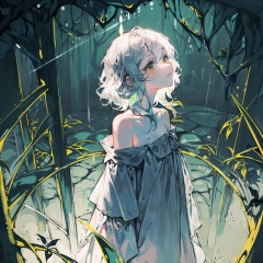 late at night,dark, light rain,dark, (((green, silver, glimmer)), limited palette, contrast, phenomenal aesthetic, best quality, sumptuous artwork, (masterpiece), (best quality), (ultra-detailed), (((illustration))), ((an extremely delicate and beautiful)), (detailed light), light rain,dark,(((camellia))), camellia, camellia,vines, forest, ruins, Blurred picture, lens flare, hdr, Tyndall effect,damp,wet, 1girl, bare shoulders, white hair, blinking, white dress, closed mouth, constel lation, flat color, braid, blinking, white robe, float, closed mouth, constel lation, flat color, looking up, standing, medium hair, standing, solo