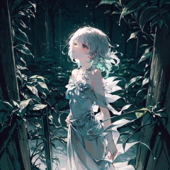 late at night,dark, light rain,dark, (((green, silver, glimmer)), limited palette, contrast, phenomenal aesthetic, best quality, sumptuous artwork, (masterpiece), (best quality), (ultra-detailed), (((illustration))), ((an extremely delicate and beautiful)), (detailed light), light rain,dark,(((camellia))), camellia, camellia,vines, forest, ruins, Blurred picture, lens flare, hdr, Tyndall effect,damp,wet, 1girl, bare shoulders, white hair, blinking, white dress, closed mouth, constel lation, flat color, braid, blinking, white robe, float, closed mouth, constel lation, flat color, looking up, standing, medium hair, standing, solo