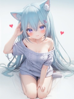 petite, loli, solo, animal ears, heart, puffy short sleeves, blue hair, long hair, off shoulder, bangs, hair ornament, gradient background,rainbow gradient, x hair ornament, animal ear fluff, looking at viewer, very long hair, blush, smile, cat ears, bare shoulders, collarbone, hand up, gradient sweater, hair between eyes, symbol-shaped pupils, arm up, heart-shaped pupils, hairclip, medium breasts, salute, bare legs,full body