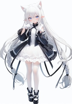 1girl, white_gloves, braid, full_body, gloves, long_hair, official_alternate_costume, pointy_ears, simple_background, solo, standing, very_long_hair, white_background, white hair, blue eyes, paw claw pose, open_mouth