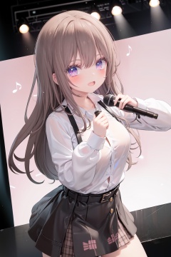 1girl, solo, microphone, smile, skirt, blush, brown eyes, long hair, open mouth, looking at viewer, brown hair, long sleeves, :d, shirt, bangs, belt, breasts, pink shirt, outstretched arm, music, black belt, medium breasts, holding microphone, singing