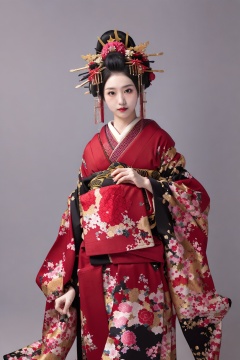 (wsoiran:1.1),1girl,oiran,headpiece,ornate,kimono,hairpin hairpin,hyogo north,oversized clothes,facing viewer,simple background,