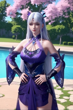 ((HRD, HUD, 8K)),((masterpiece, best quality)), highly detailed, (perfect anatomy:1.2),1girl, solo, long hair, white hair, blue hair, hair ornament, jewelry, earrings,dress, blue dress, bare shoulders, purple dress, detached sleeves, gloves,pool, water,standing, (upper body), looking at viewer, hands on hip, <lora:XiaoYiXian_v2.0-shishu:0.8>