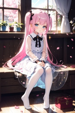 masterpiece,best quality,(ray tracing,cinematic lighting),sunlight,indoors, potted plant, colorful petals, colorful flowers,1girl, solo, (petite, loli :1.4),full body,half-closed eyes,(no shoe:1.2),(pastel (medium):1.35),sparkle,1girl,[(pink hair:1.5)::5],(blue eyes|sparkle),(white pantyhose:1.2|see-through),(absurdly long hair:1.4),(one side up:1.3),(white+pink dress:1.25|lolita),long sleeves, (side-tie panties:0.3),sitting backwards,(light smile:0.4), (:D:0.345),momo blossoms,