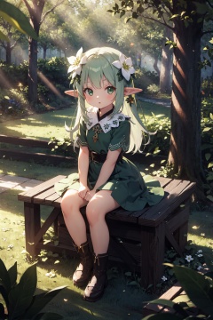 masterpiece,best quality,(ray tracing,cinematic lighting),loli,full body, sitting, looking at viewer, solo, 1girl, elf girl, long hair, green hair, [green|blue] eyes, dress, white hair flower, hair ornament, wind, leaf, tree, forest