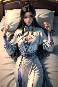 (8k, RAW photo, best quality, masterpiece:1.2),(realistic, photo-realistic:1.3), ultra-detailed, extremely detailed cg 8k wallpaper,(crystalstexture skin:1.2), (extremely delicate and beautiful), (perfect hands, perfect anatomy:1.2),1girl, solo, jewelry, forehead mark, facial mark, earrings,chinese clothes, dress, long sleeves, white dress,looking at viewer, (cowboy shot:1.3), lying on back, bed shee, <lora:LuXueQi_v1.1:0.85>