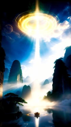 (Concept) (Movie Special Effects) (Light Effect Particles) (Rune, Magic) Wide Angle Lens (Huge Suspension Energy: 1.5) (Transparent Art) The scholar's whims gather into a layer of melodious fairy light, like the blessing of a god. The radiance circulates around the scholar, rendering him solemn and mysterious. The scholar holds the jade Ruyi, which is like a magic weapon of the gods. Immortal light emanates from Ruyi, forming a halo of protection. The whole scene seems to be a fairyland scene where an immortal is blessed by the gods, conveying the unique charm of the Chinese mysterious fairy tale.
