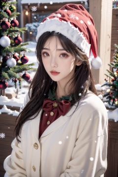 1 girl,Upper body,Christmas,Mid-range lens, Look at the viewer, eyeglasses,indoor, christmas tree, It snows,standing,Panoramic lens,Christmas costume, Nebula