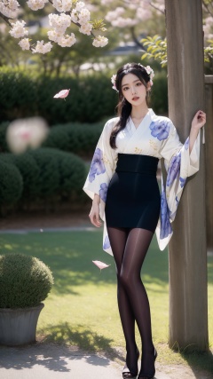 black_pantyhose,tutututu,(nsfw),1girl, (white kimono),(floral print), long sleeves, long hair, full body, sandals, standing, (cowboy shot),(masterpiece, high quality, best quality), (colorful),(delicate eyes and face), volumatic light, ray tracing, extremely detailed CG unity 8k wallpaper,solo, ((flying petal)), outdoors, house, japanese yard, pine tree, ((flowers)),<lora:tutuJG_00008:0.85>