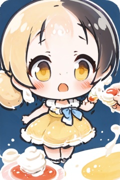 淘气宝贝, (1 girl :1.3), (detailed light), (an extremely delicate and beautiful), volume light, best shadow, flash, Depth of field, dynamic angle, Oily skin, (girl with cream all over her face), (panic), lots of ice cream, sundaes, (yellow dresses), dresses full of cream, ketchup, black hair, yellow eyes, (eromanga:1.2), (megami:1.2), chibi,<lora:EMS-165741-EMS:1.000000>