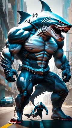 (View from the end of the horizon) (Intricate muscle details) Monster shark man, muscular, sitting on the street