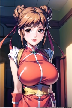 yuanshen, 1girl, solo, brown hair, hair bun, brown eyes,  gloves, ribbon, orange shirt, short hair, hair ribbon, double bun,cowboy_shot,nice hands,  Beautiful long legs,  Beautiful body,  Beautiful Nose,  Beautiful character design,  perfect eyes,  perfect face,  expressive eyes,  perfect balance,  looking at viewer,  closed mouth,  (innocent_big_eyes:1),  (Light_Smile:0.3),  official art,  extremely detailed CG unity 8k wallpaper,  perfect lighting,  Colorful,  Bright_Front_face_Lighting,  White skin,  (masterpiece:1),  (best_quality:1),  ultra high res,  4K,  ultra-detailed,  photography,  8K,  HDR,  highres,  absurdres:1.2,  Kodak portra 400,  film grain,  blurry background,  bokeh:1.2,  lens flare,  (vibrant_color:1.2),  professional photograph,  (Beautiful,  large breasts:1.6),  (beautiful_face:1.5),  (narrow_waist),