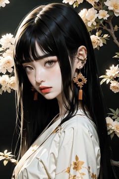 1girl,solo,(hime cut:1.2),black hair,bangs,jewelry,long hair,earrings,blunt bangs,looking at viewer,japanese clothes,upper body,closed mouth,branch,brown eyes,red lips,plant,makeup,nail polish,<lora:linhe fuheigongzhuqie_20231018110238:0.7>,