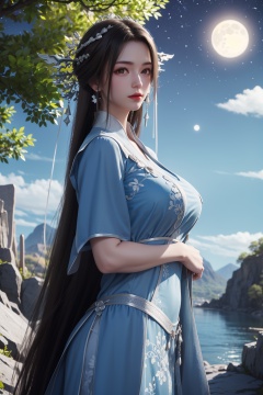 outdoors,(black hairs:1.2),(large breasts:1.3),flowers,floating hair,sky,rainbow,moon,sky,stars,(arms at sides:1.3),leaning,mountains,crystal,sea,desert,1girl, solo, earrings, brown hair, jewelry, upper body, looking at viewer, dress, long hair, tree, hair ornament, outdoors, blurry, chinese clothes, sky, day, blue sky, blue dress,looking at viewer,closed mouth,<lora:dingdang-surou:0.55>