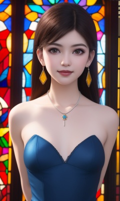 (,1girl, ,best quality, )<lora:365-DA-梦塔·雪谜城-艾妙妙:0.7>,,ultra detailed background,ultra detailed background,ultra realistic 8k cg,,, (close-up portrait),(upper body:1.22),(realistic:1.11),(Photo-referencing),HDR,Studio Lighting,Soft Lighting, ,, a slender petite little girl,Delicate muscle lines,(Skinny body),(solo:1.5),( looking at viewer:1.22),The white shiny skin, (smirk:1.2),(dynamic pose),(arms behind back),arms at sides, (very long payot),(Absurdly long Brown straight hair:1.22),parted bangs, (floating hair), (jewelry:1.17), necklace, earrings,(colorful:1.27),(stained glass background),(),(()),,